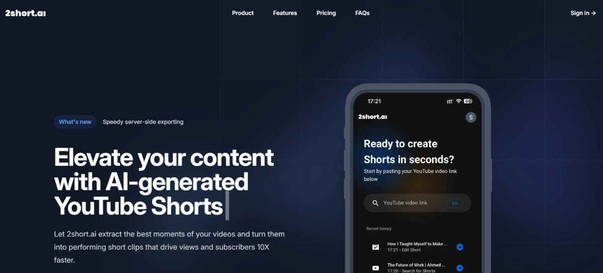 Paid2short AI is an AI-driven platform that transforms long-form videos into engaging short clips. It analyzes videos to identify key moments and generates optimized short clips to boost viewership and subscribers. Ideal for YouTubers, podcasters, educators, and anyone seeking to maximize content reach through repurposed video content. By extracting the most compelling parts of a video, creators can efficiently create high-impact shorts, reducing editing time and increasing visibility. Simply paste your YouTube video link into 2short AI to let AI work its magic. This tool is particularly effective for spoken-word content such as podcasts, education, commentary, reviews, and speeches. It currently supports multiple languages including Dutch, English, French, German, Indonesian, Italian, Portuguese, Spanish, Japanese, Turkish, and Russian.