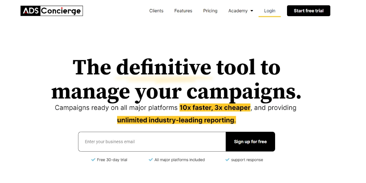 PaidAds Concierge is an ad management platform that enables businesses and agencies to efficiently oversee their ad campaigns across various platforms. This tool simplifies the process of creating, monitoring, and optimizing ad campaigns. With its reliable features and detailed reporting capabilities, Ads Concierge streamlines the management of advertising efforts. Additionally, it offers flexible pricing plans suitable for businesses of all sizes. By using Ads Concierge, users can easily handle the complexities of managing ads, ensuring a more effective and organized approach to their advertising strategies.