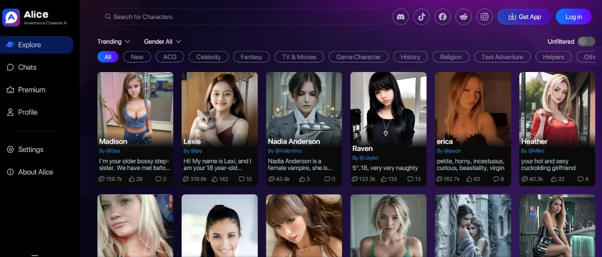 PaidAlice AI uses artificial intelligence to create engaging character interactions through chat. Users can choose from various character personas, request generated images, and even engage in voice chat for a more interactive experience. The app is versatile, catering to different interests, and users can customize their experience by selecting characters and filtering content. Premium options offer advanced features like enhanced photo generation, unlimited message editing, and access to NSFW content, giving users full control over their chat interactions.