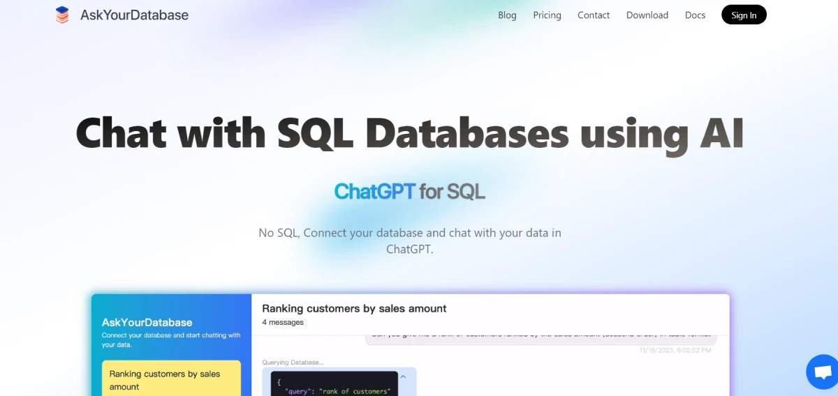 PaidAsk Your Database is an AI-powered platform that simplifies database interaction by allowing users to communicate with SQL and NoSQL databases using natural language queries. Say goodbye to complex SQL coding and APIs. This AI-native SQL database client lets you chat with your databases, gain insights, visualize data, insert mock data, and design table schemas effortlessly, without the need to write any code. With Ask Your Database, you can streamline database tasks and access valuable information without technical barriers. Whether you're a beginner or an experienced user, this tool eliminates the complexities of database management, making data analysis and manipulation more accessible and efficient for everyone.