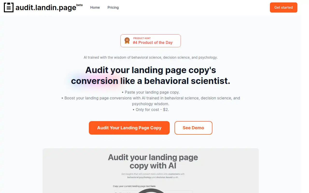 PaidAudit Beta is a modern tool that uses AI and behavioral science to enhance your landing page copy for better conversion rates. By analyzing your copy and providing tailored suggestions, it empowers creators to effectively convey their product's value. This tool emphasizes the importance of compelling language over design, aiming to appeal to quick decision-making and emotional connections. With insights derived from behavioral economics, Audit Beta offers accessible guidance without the need for extensive learning. Priced at just $2, it democratizes access to behavioral insights that can significantly impact marketing strategies. Whether you're an experienced marketer or a beginner, Audit Beta promises to revolutionize your approach by leveraging the power of behavioral insights in a user-friendly manner.
