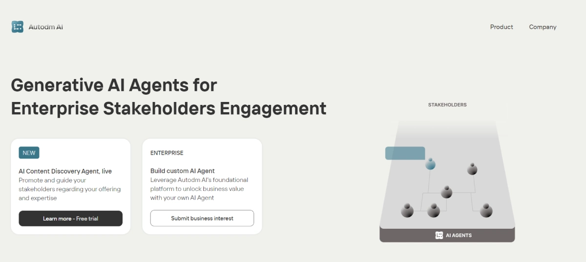 PaidAutodm AI is a platform that develops generative AI agents tailored for enterprise stakeholder interaction. These AI agents engage with customers, partners, and employees to enhance communication and boost engagement. With the ability to comprehend and produce human-like text, Autodm AI's generative AI agents are versatile tools for various enterprise applications.