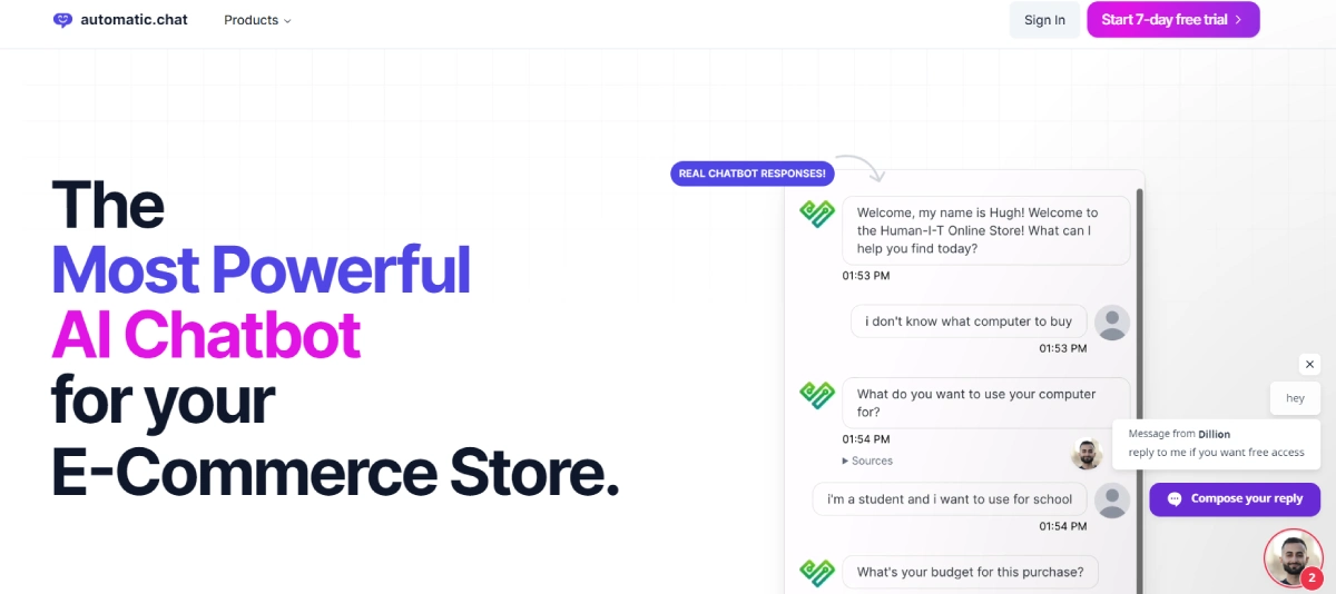 PaidAutomatic Chat is an AI chatbot platform that uses advanced technology to give quick, human-like responses to people visiting websites. By harnessing the capabilities of GPT-4, it offers businesses a complete tool to enhance customer communication and involvement on their sites. With Automatic Chat, users benefit from instant, natural interactions that can improve customer satisfaction and engagement. This platform is ideal for businesses seeking to provide a seamless and interactive experience for their website visitors.
