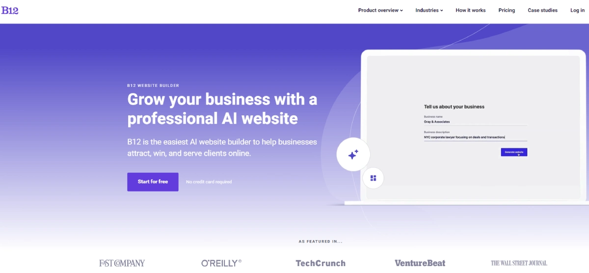 PaidB12 is an AI website builder that helps businesses create professional websites quickly and easily. By using artificial intelligence, B12 simplifies the website creation process, making it faster and more efficient than traditional methods. This tool is perfect for businesses aiming to establish a strong online presence without the complexities of manual website development. With B12, users can attract, engage, and serve clients online with ease.