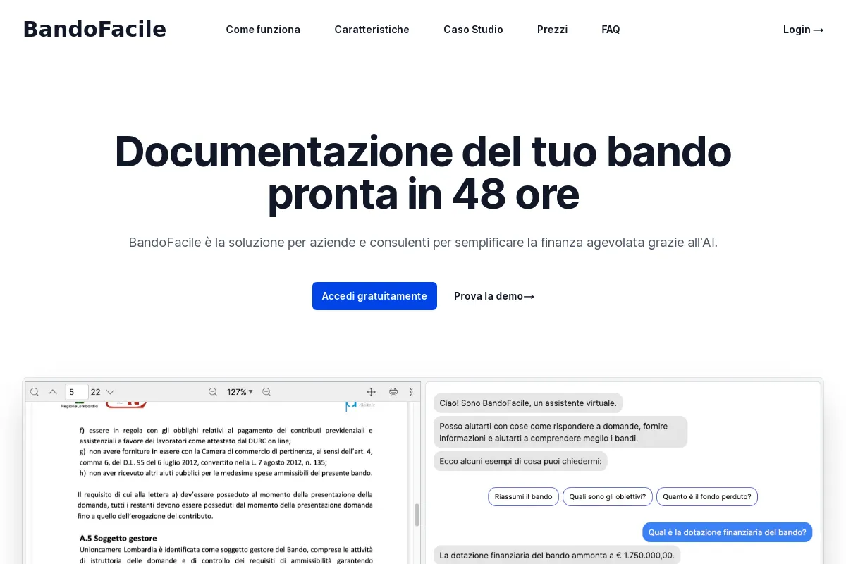 PaidBandoFacile enables quick creation of personalized tender documents for business subsidies and grants. Within 48 hours, this AI-powered service simplifies the application process. By using BandoFacile, businesses can easily participate in tenders, saving time and effort. This tool streamlines the documentation process, making it more efficient and accessible for applicants.