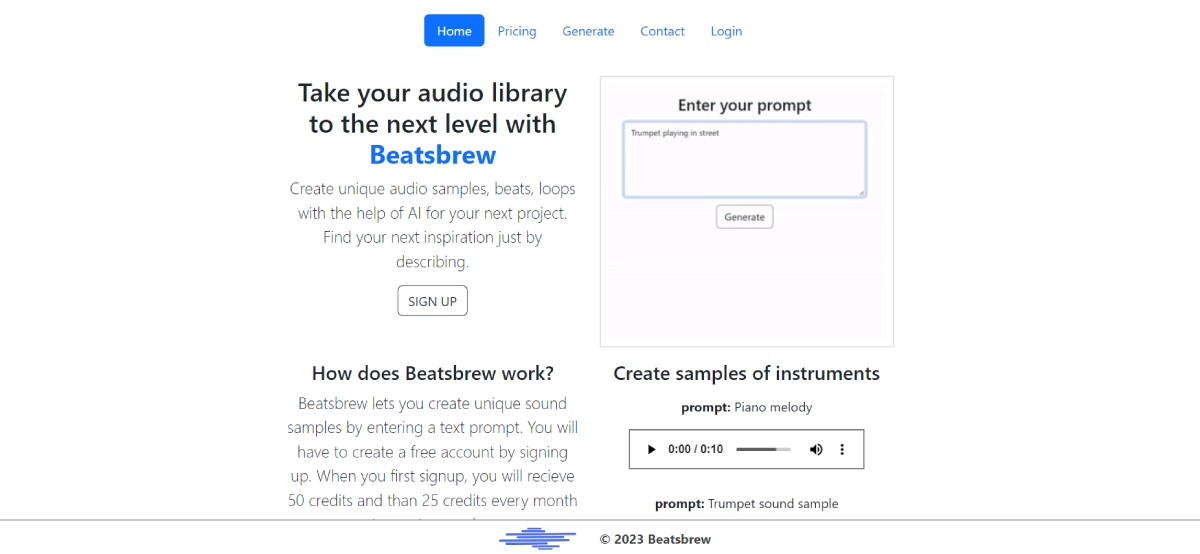 PaidBeatsbrew is a platform that uses AI to generate royalty-free audio samples, beats, and loops based on text prompts. It offers producers a vast array of unique sounds to spark creativity. By converting text into audio, Beatsbrew enables musicians to experiment with new sonic ideas without limits. This tool allows producers to quickly craft custom samples to elevate their projects effortlessly.