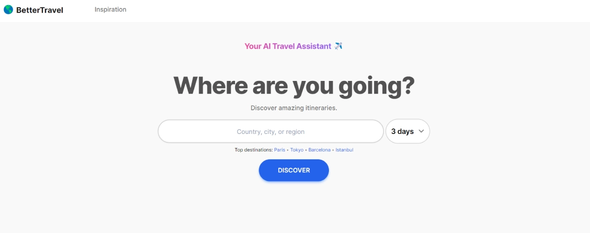 FreeBetter Travel AI helps you discover new destinations and create personalized itineraries that align with your unique travel preferences. Simply click "Discover" to unlock a world of possibilities tailored just for you. This AI travel assistant serves as your inspiration hub, offering seamless itinerary suggestions that match your desires effortlessly. Beyond being an assistant, Better Travel AI acts as your personalized guide, ensuring each journey reflects your individuality. Let this tool take the lead in turning your travel dreams into reality.