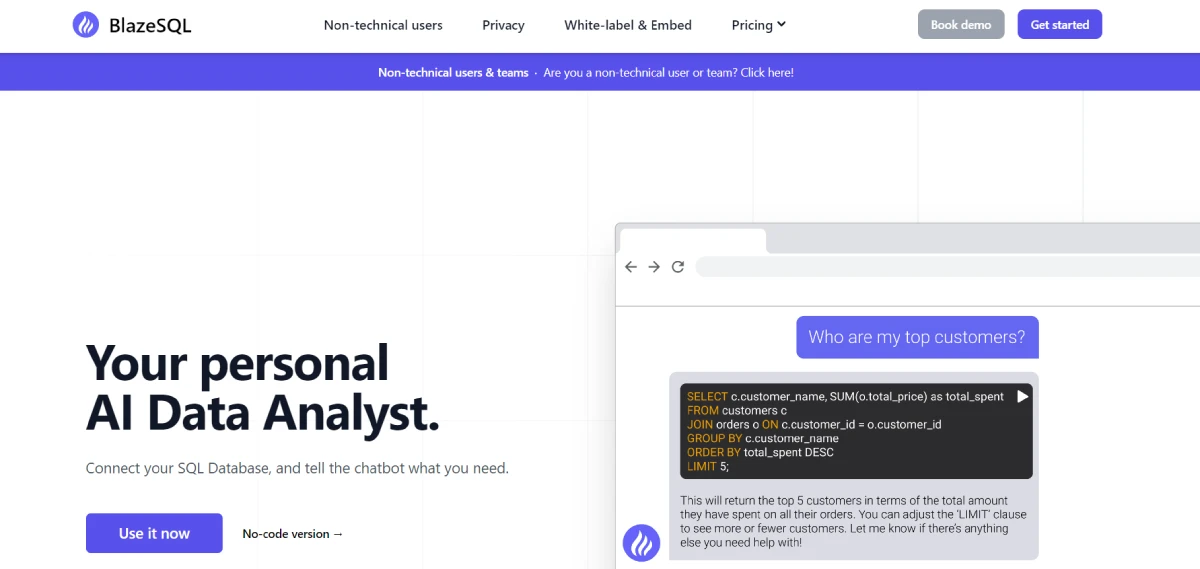 PaidBlazeSQL empowers non-technical users and teams to effortlessly interact with SQL databases through natural language queries. By enabling users to ask questions in plain language, BlazeSQL simplifies data analysis and enhances accessibility to insights. Acting as a personal data analyst, this AI-powered platform connects to SQL databases, generates SQL code, executes queries, and presents results visually. By streamlining the data analysis process, BlazeSQL facilitates quicker decision-making and empowers users to derive valuable insights without the need for advanced technical skills.