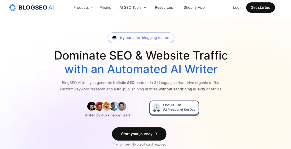 PaidBlog SEO AI is a content creation and SEO platform that streamlines the content creation process from idea generation to publishing. It helps businesses and content creators enhance their online presence effectively. With various pricing plans available, Blog SEO AI is accessible to different needs and budgets. Key features include content ideation, optimization for search engines, and easy publication.