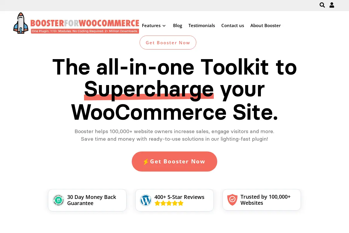 PaidBoost your WooCommerce website with Booster for WooCommerce. This comprehensive plugin offers over 100 features to customize your online store without coding. Save time by avoiding multiple plugins and potential conflicts. Since 2014, Booster has improved WooCommerce, with 2 million downloads and 400+ 5-star reviews. Enjoy a risk-free 30-day money-back guarantee and responsive customer service within 24 hours. Replace up to 45 plugins, potentially saving over $1200 yearly per site. Trusted by 100,000 websites, Booster for WooCommerce is a cost-effective solution for enhancing your online store efficiently.