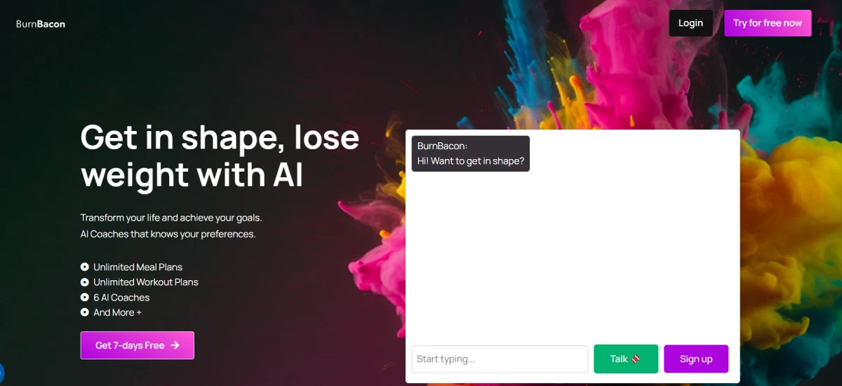 PaidBurnBacon helps you achieve your fitness and weight loss goals through an AI-powered personal health assistant. It provides tailored meal plans from Mia the Chef, personalized workout routines from Ben the Coach, constant motivation from Ella the Mentor, evidence-based diet strategies from Lucas the Dietitian, and customized rest solutions from Sophia the Sleep Expert. BurnBacon also offers activity ideas from Oliver the Activity Pal to keep your fitness journey exciting. With BurnBacon, you get expert advice and support perfectly suited to your needs and preferences, helping you reach your full potential and improve your overall health and wellness.