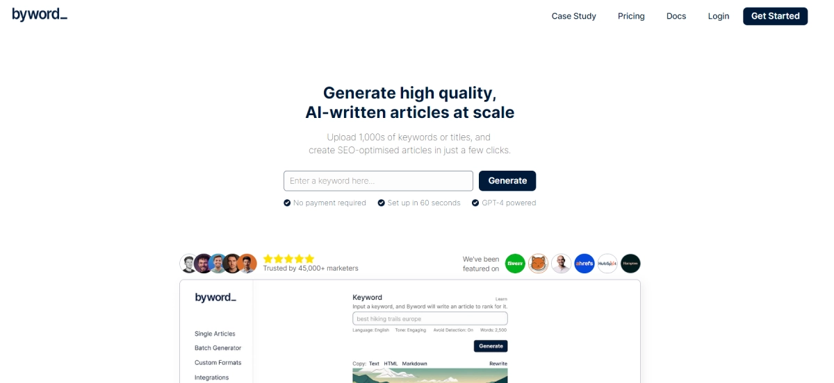 PaidByword AI is a powerful tool that uses artificial intelligence to generate articles efficiently, making it ideal for businesses seeking high-quality, SEO-friendly content in large quantities. This tool automates content creation for digital marketing, offering features like bulk article generation, image creation, internal linking, custom CTAs, and multilingual support. Byword streamlines the process of creating optimized articles, saving time and increasing website traffic with just a few clicks. With subscription plans ranging from Starter to Unlimited Plus, users can choose the level of service that best fits their needs and budget. Byword's pay-as-you-go option at $5 per article allows flexibility for occasional users. The tool's seamless integrations and evolving SEO capabilities make it a valuable asset for digital marketers and agencies looking to scale their content production efficiently.