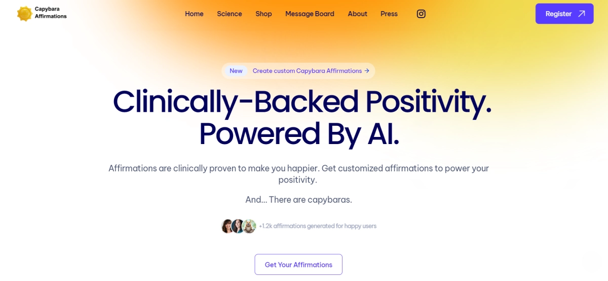 PaidCapybara Affirmations AI crafts personalized affirmations to promote positivity and mental well-being. This AI-driven tool tailors affirmations to individual preferences based on scientific research. It blends evidence-based positivity with interactive elements. By delivering tailored affirmations, users can improve their mental health, making it beneficial for anyone seeking a positivity boost. The incorporation of capybaras adds a charming element to the experience. Capybara Affirmations AI offers various subscription options.