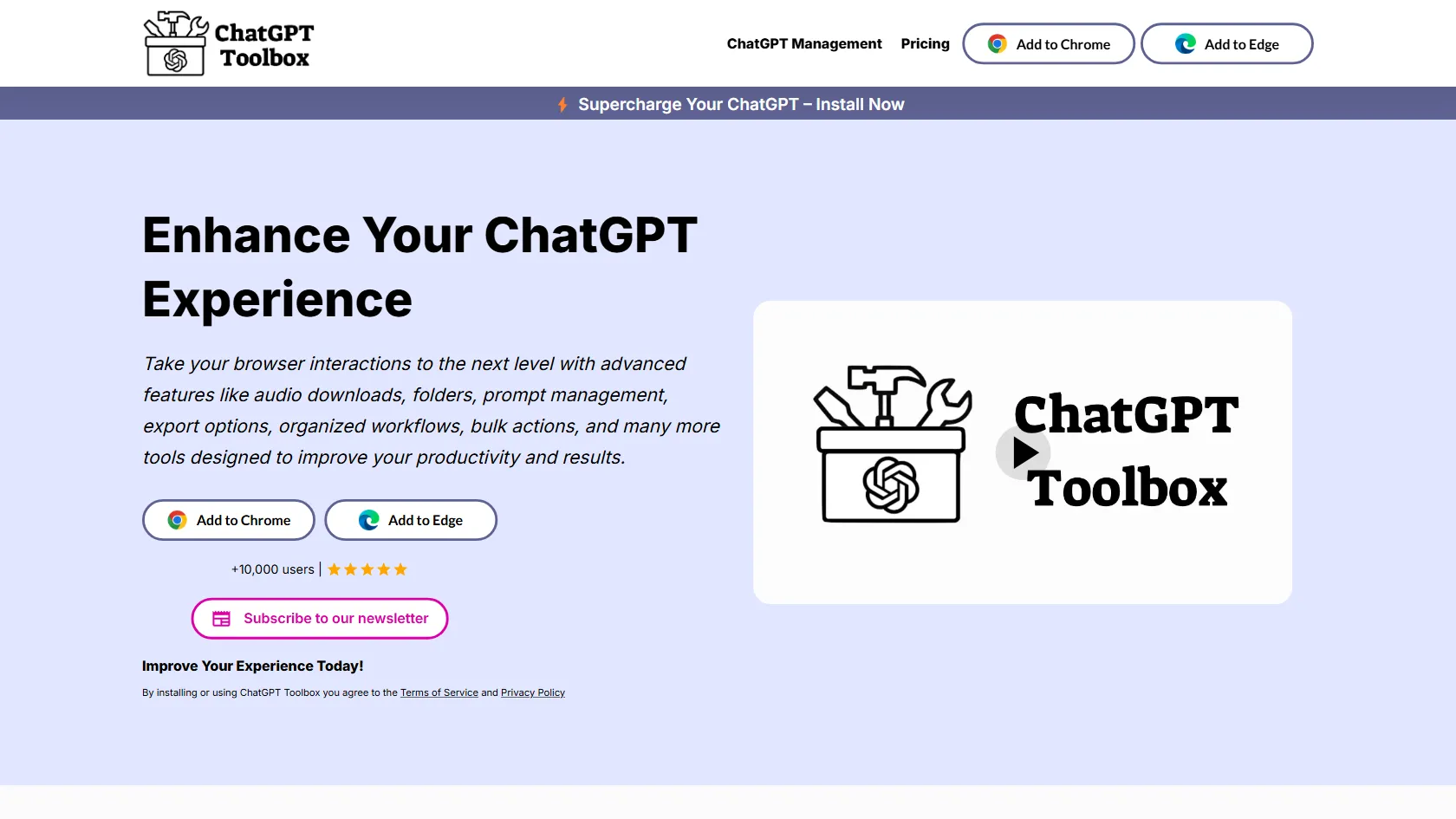 Enhance your browser interactions with ChatGPT by installing the ChatGPT Toolbox extension. This tool allows you to organize conversations into folders, manage prompts, download messages as MP3 files, and offers various productivity features. Streamline your workflow and boost your efficiency with ChatGPT using this toolbox.