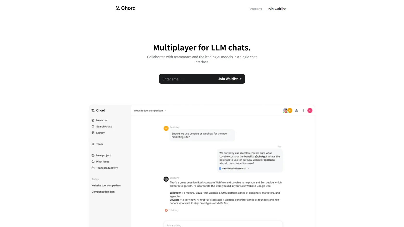 Chord enables real-time collaboration among teams using AI models. Users can create group chats to interact with multiple LLMs simultaneously. This platform eliminates disjointed AI conversations by offering a unified space for team collaboration.
