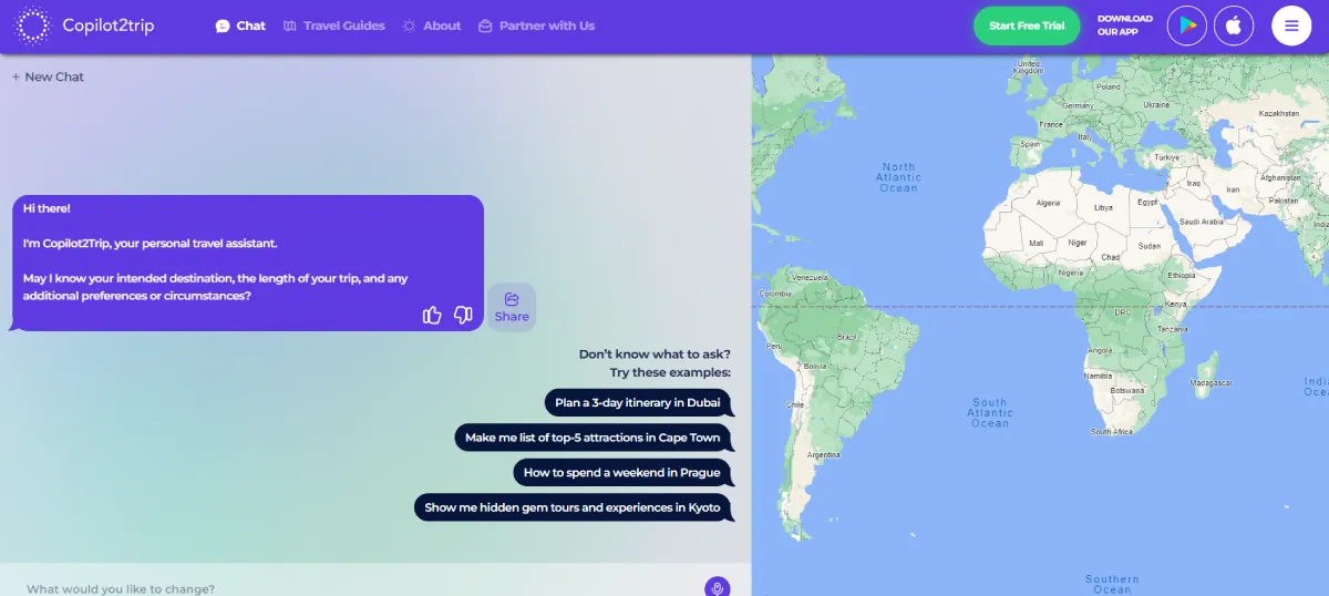 PaidCopilot2trip is a conversational AI tool designed to simplify travel planning. By acting as a virtual assistant, it helps users organize and customize trips effortlessly. Users can chat with Copilot2trip to provide trip details such as destination, length, interests, and constraints, allowing the tool to handle the rest. Whether traveling alone, with a partner, family, or in groups, Copilot2trip streamlines logistics so travelers can focus on enjoying their trips. It covers popular global destinations across 6 continents and is accessible via web or mobile apps for Android and iOS. Paid subscription plans offer full access to features with free trials available. Early user reviews highlight the convenience, customization, and value compared to manual trip planning.