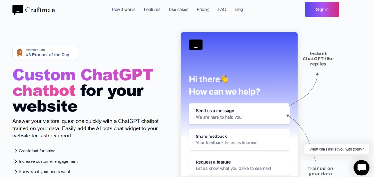 PaidCraftsman AI is an AI chatbot builder that integrates ChatGPT to deliver real-time, precise responses to user inquiries on websites. By training the chatbot with a company's specific information, Craftsman ensures the chat widget can handle a variety of questions related to the site's content. The setup process is simple, requiring just the upload of a document or a website link to begin. Implementing Craftsman's AI chatbot on a website is straightforward, allowing businesses to quickly boost interactivity by uploading relevant documents or linking to their website content. Craftsman offers a risk-free trial with no credit card required and a 30-day money-back guarantee.
