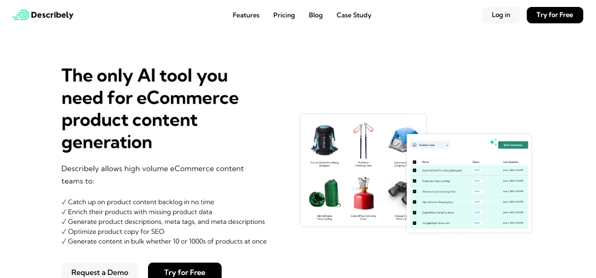 PaidDescribely AI streamlines product content creation for eCommerce retailers, especially those managing multiple brands and extensive product catalogs. This tool tackles content bottlenecks, enhances product data, and optimizes descriptions for SEO. It efficiently generates top-notch product descriptions, meta tags, and meta descriptions in bulk to ensure consistent, accurate, and compelling eCommerce content. Describely integrates easily with various eCommerce platforms for easy data import and updates synchronization. Its flexible pricing plans cater to diverse needs.