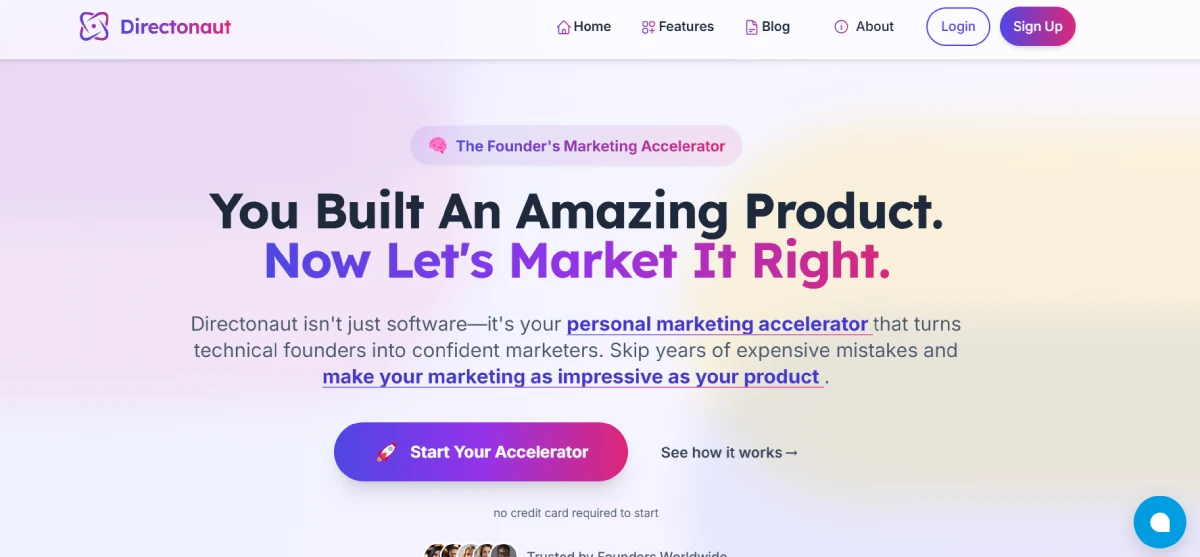 PaidDirectonaut is a personalized marketing accelerator that helps technical founders become confident marketers. It offers tailored marketing strategies, interactive AI personas, and actionable insights to bridge the gap between technical expertise and effective marketing. Whether you're a startup founder or freelancer, Directonaut provides the tools needed for successful product marketing. By analyzing data from over 2,000 successful companies, it gives data-backed recommendations customized to your business. Directonaut also includes features like pitch training and LinkedIn optimization to refine messaging and enhance online presence. Overall, Directonaut simplifies marketing for technical founders by offering practical tools and strategies to boost marketing confidence and success.