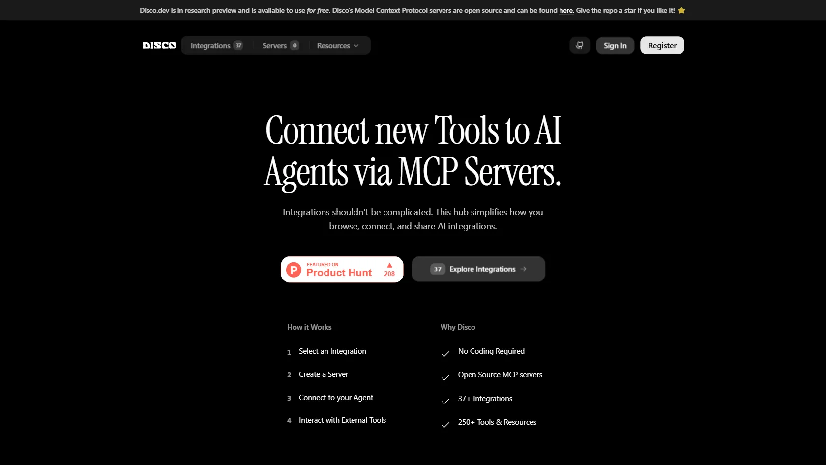 Using Disco.dev involves the following steps: 1. Browse integrations on the platform. 2. Select a suitable integration. 3. Create an MCP server instance. 4. Connect the server to your AI agent (e.g., Claude or VSCode). 5. Enable interaction with external tools like databases, APIs, or productivity apps. 6. Solve issues such as data retrieval, task automation, and enhanced AI capabilities without manual coding. Disco.dev is designed to streamline workflows and enhance AI system functionality.