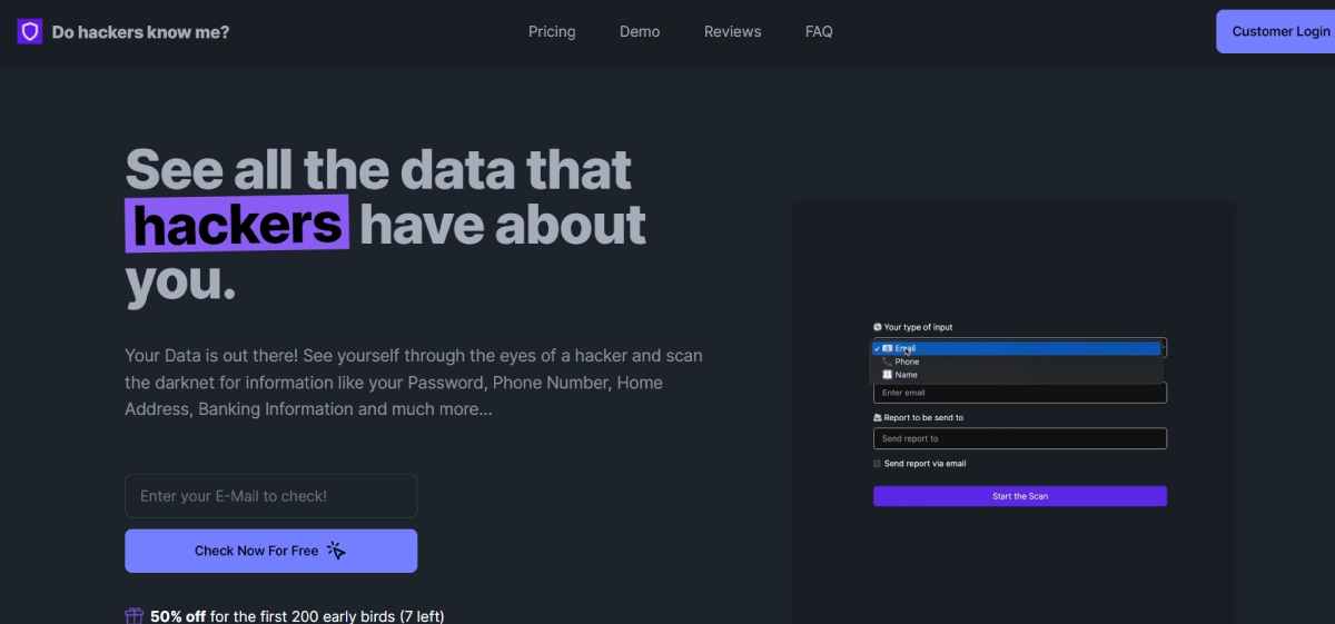 PaidDo Hackers Know Me is a tool that scans the dark web to uncover personal information hackers may have about you, such as passwords, phone numbers, addresses, and banking details. By entering your email address, you can check for data leaks and receive detailed reports on what information is accessible to hackers. This service helps users understand their vulnerabilities and empowers them to take necessary steps to secure their data. Ideal for those concerned about data privacy and security, Do Hackers Know Me enables users to proactively protect their personal information.