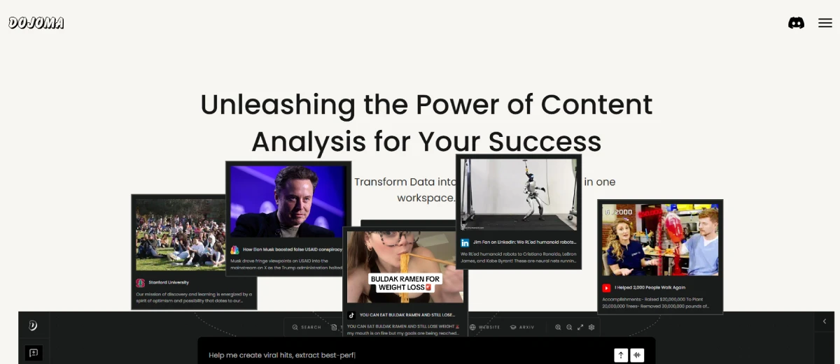 PaidDojoma AI is a content analysis platform that empowers creators and marketers to extract valuable insights from diverse content types. Users can analyze trends, predict engagement, and optimize content strategies efficiently. Whether handling text, video, images, or research papers, Dojoma AI streamlines data-driven decision-making for content success. By leveraging this tool, users can make informed decisions to enhance their content performance and achieve their goals effectively.