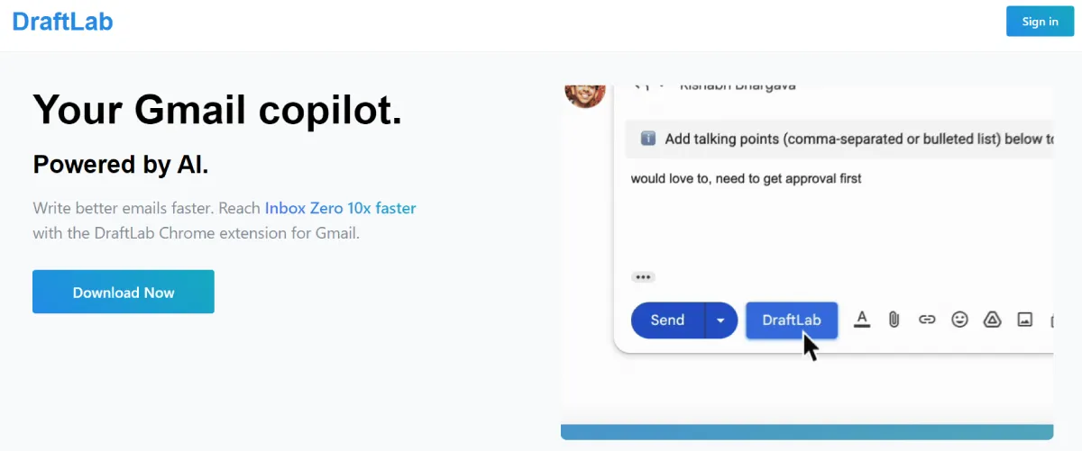 FreeDraftLab is an AI tool that easily integrates with Gmail to assist with email drafting. It provides personalized response suggestions tailored to each recipient, helping you save time while maintaining a personal touch. The tool learns from your edits to enhance relevance continuously. With features like autopilot and personalization, DraftLab streamlines email tasks without changing your email client. It prioritizes user privacy and offers pay-as-you-go pricing. Ideal for professionals, small businesses, and solopreneurs, DraftLab empowers users to efficiently manage emails and boost productivity.