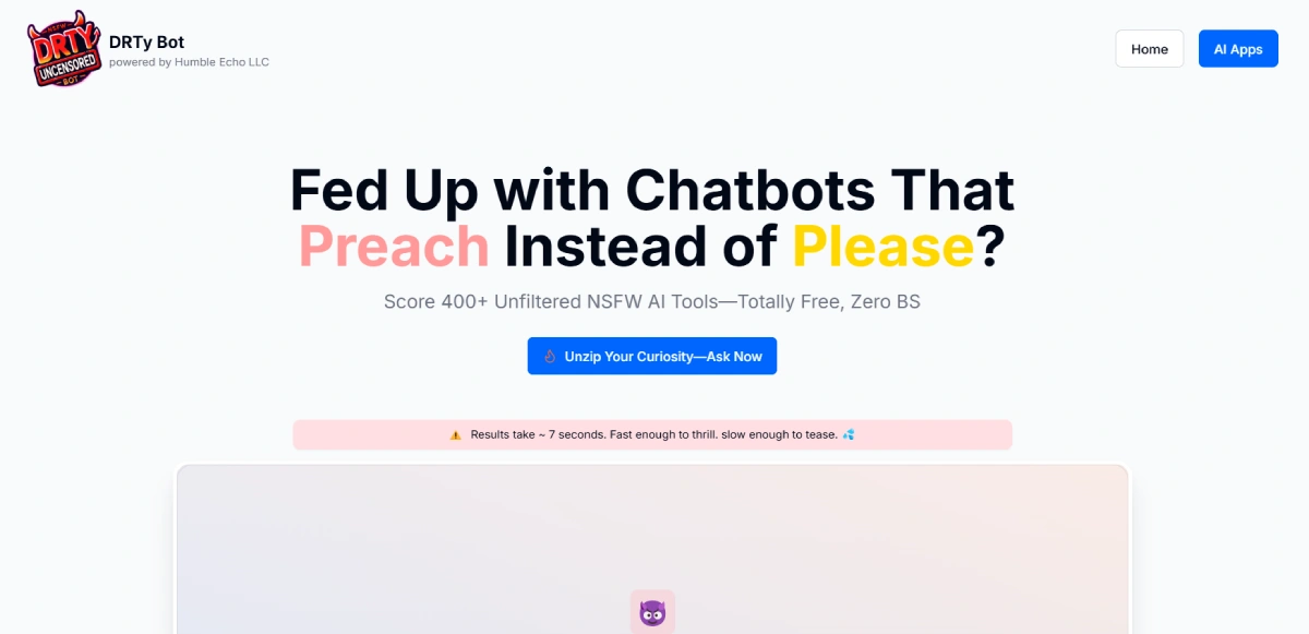 FreeDRTy Bot enables users to explore over 400 NSFW AI tools without censorship or restrictions. It offers real-time, verified results for chatbots, image generators, and roleplay assistants. Ideal for those seeking adult AI experiences without filters, DRTy Bot provides a platform for entertainment, creativity, and personal exploration. With DRTy Bot, users can access a wide range of NSFW tools easily and without hidden paywalls, allowing for unrestricted discovery and utilization of adult AI technologies.