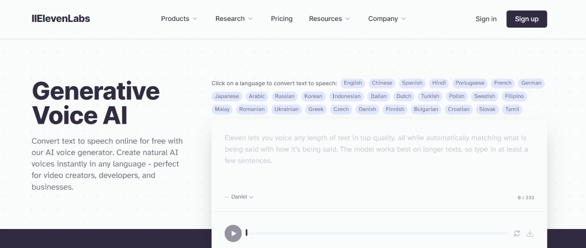 PaidEleven Labs enables users to convert text into natural-sounding speech using Generative Voice AI. This innovative tool supports 29 languages and offers 120 different voices, allowing video creators, developers, and businesses to enhance their projects with lifelike audio. By incorporating human-like intonation and inflections, Eleven Labs' AI voice generator boosts engagement and immersion in various content types.