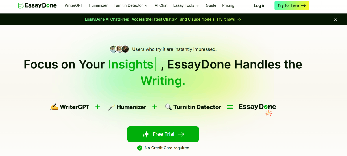 PaidEssayDone AI is an academic writing platform that streamlines essay creation, boosts originality, and upholds academic honesty. It offers tools like WriterGPT for generating content, Humanizer for enhancing text quality, Turnitin Detector for avoiding plagiarism detection, and AI Chat for assistance. Users such as students, researchers, and professionals can effortlessly create essays, evade AI detection, and verify content authenticity.