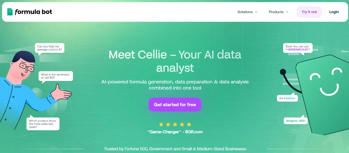 PaidFormula Bot is an AI service designed to enhance data and spreadsheet work efficiency. It offers automatic formula creation, data analysis, and spreadsheet automation through a virtual data analyst named Cellie. Users can effortlessly generate complex Excel formulas, SQL queries, regex, and scripts using plain language descriptions without coding skills. By uploading data and interacting with Cellie, users can receive insights in the form of charts, tables, and recommendations. The tool also provides add-ons for Excel and Google Sheets that offer sentiment analysis, classifications, and information extraction features. Formula Bot is free with usage limits, while paid plans offer more capabilities. It is used by various organizations to save time and optimize data processes effectively.