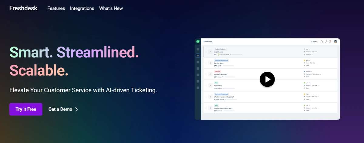 PaidFreshdesk is a customer support software that helps service teams work more efficiently and boost customer satisfaction. It offers a centralized platform to manage customer interactions from various channels like email, chat, social media, and phone. Businesses of all sizes can use Freshdesk to streamline their support processes and provide a seamless customer experience. With Freshdesk, organizations can consolidate support activities, manage tickets, automate tasks, offer self-service options, and access analytics. This tool is beneficial for companies looking to enhance response times, cut operational costs, and build customer loyalty through effective support management.