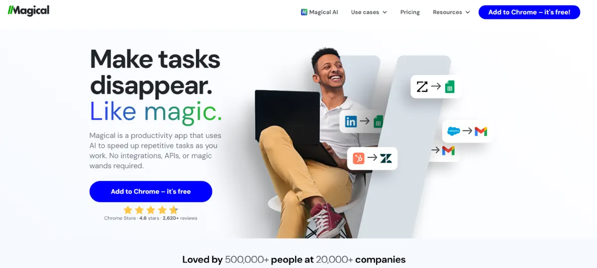 FreeGetMagical AI is a browser-based productivity extension powered by AI that automates repetitive tasks like data entry, form filling, and information transfer across various apps. With a simple one-click installation and no complex setup needed, GetMagical AI can save users up to 7 hours per week on manual tasks. Acting as an extra set of hands, it streamlines workflows on over 10 million websites without accessing user data. Trusted by over 500,000 users globally, including companies like Netflix and PayPal, GetMagical AI enhances efficiency without compromising security. The service is free to start on the Chrome Web Store, with optional paid plans for additional features. By automating mundane tasks, GetMagical AI liberates time for more impactful and creative work, making it an essential tool for boosting productivity.