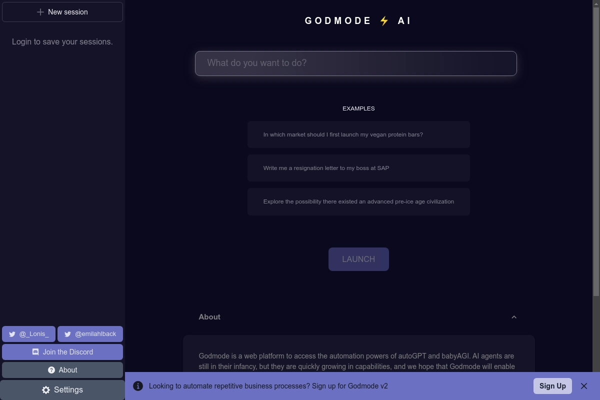 FreeGodmode is a user-friendly platform that grants easy access to modern AI agents via a simple web interface. It allows users to employ automation for personal and business tasks effortlessly. By interacting with Godmode in a conversational manner, users can request solutions for various tasks or objectives using natural language. This tool automates a wide array of personal and business processes, making it ideal for optimizing workflows and sparking new ideas. Godmode uses advanced AI capabilities for generating content and understanding conversations, resulting in human-like interactions that enable automation. The platform's goal is to make advanced AI accessible to all, empowering individuals and fostering innovation without the need for coding skills.