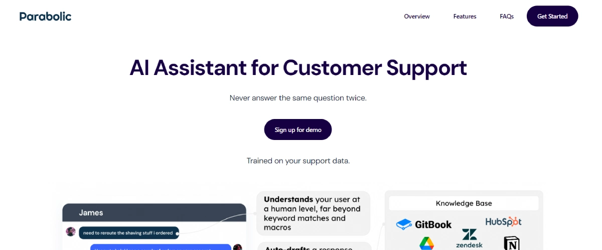 FreeGrow Parabolic is an AI-powered tool that integrates ChatGPT technology into customer support operations within ticketing software like Intercom and Zendesk. By analyzing support data, it delivers accurate responses to customer inquiries, reducing repetitive tasks for support teams. The system continuously learns and improves based on agent feedback, expanding its knowledge with each interaction. Businesses can enhance efficiency and turn support into a strategic sales channel by integrating Parabolic, which identifies upselling and cross-selling opportunities.