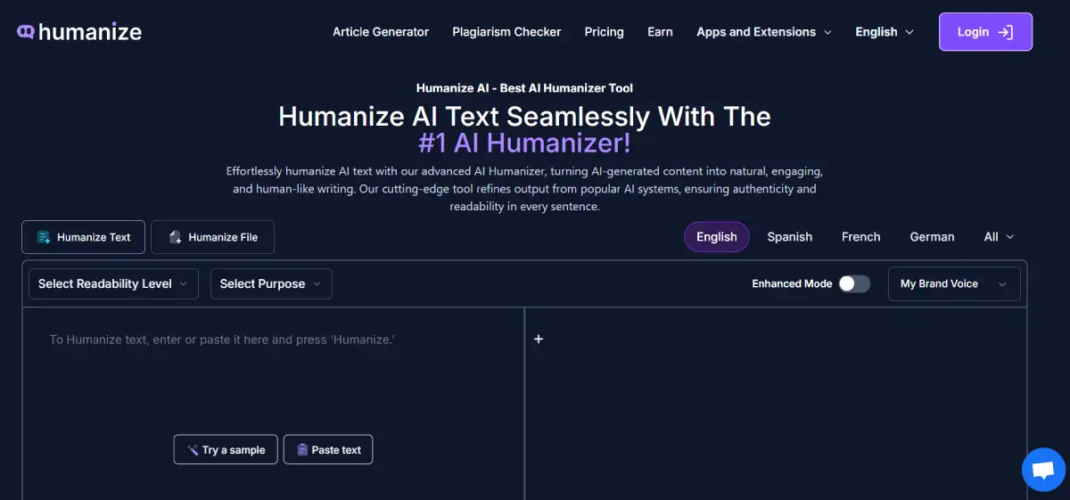 PaidHumanize helps refine AI-generated content to sound more natural and human-like. It transforms text from common AI systems into authentic, readable writing that can bypass AI detectors. This tool is ideal for students, professionals, marketers, and content creators who want their AI drafts to feel genuine and pass AI detection checks. With Humanize, users can convert robotic or repetitive AI drafts into engaging, conversational text by adjusting tone, structure, and readability to meet specific goals. The platform supports multiple languages and offers various humanization modes to cater to a wide range of content needs.