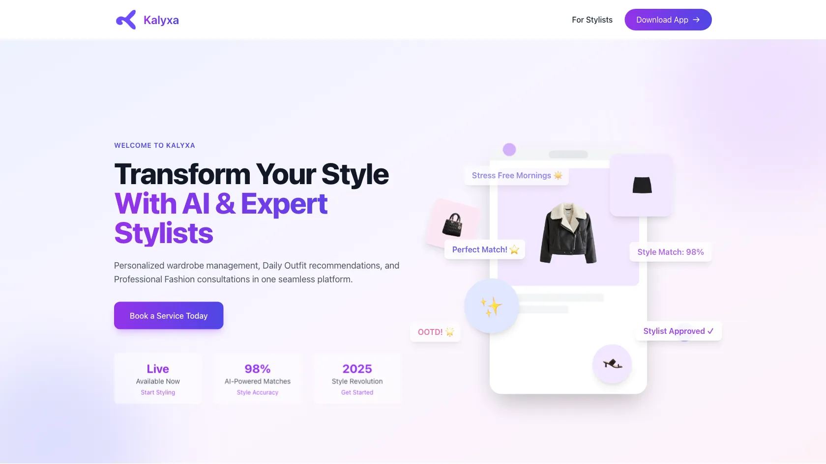 With Kalyxa, simply upload your wardrobe to the app. Get daily outfit suggestions tailored to your style, weather, and schedule. Connect with expert stylists for personalized fashion advice. Effortlessly manage your wardrobe and explore new outfit combinations.