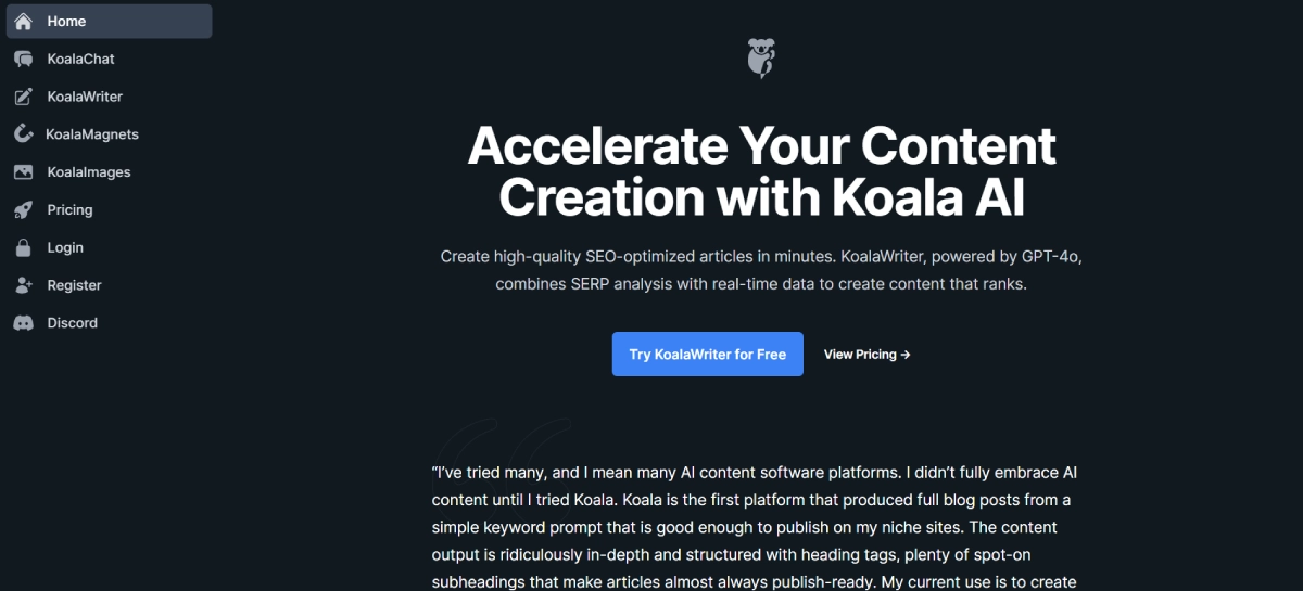 PaidKoala AI is a tool that helps users create top-notch, SEO-friendly content. It combines real-time data and SEO analysis to assist in producing articles, blog posts, and other written materials efficiently. Ideal for content creators, SEO specialists, and bloggers, Koala AI offers tools like KoalaWriter, which generates SEO-optimized articles by analyzing search engine results. KoalaChat is another feature that blends chatbot functions with real-time data to aid in content creation and SEO tasks. Noteworthy features include seamless integration with WordPress, Amazon data, and Google Sheets, as well as the ability to automatically create high-quality images and videos.