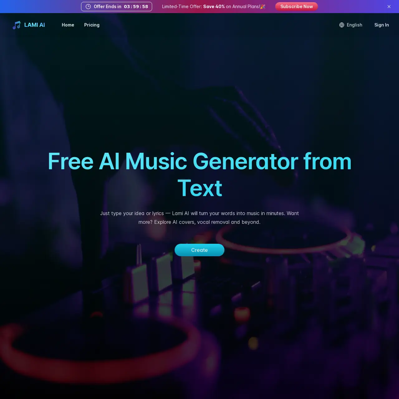 PaidLami.ai is a free AI music generator that turns text descriptions or lyrics into unique music quickly. It caters to a wide range of users, from beginners to experienced creators, providing a simple and royalty-free way to create music without the need for instruments or studio equipment. Whether you're composing songs, remixing tracks, or producing audio content, Lami.ai streamlines the process with features like an AI vocal remover, stem splitter, and commercial licensing support. With Lami.ai, users can effortlessly generate original music in minutes, making it a valuable tool for anyone looking to explore music creation without technical barriers.