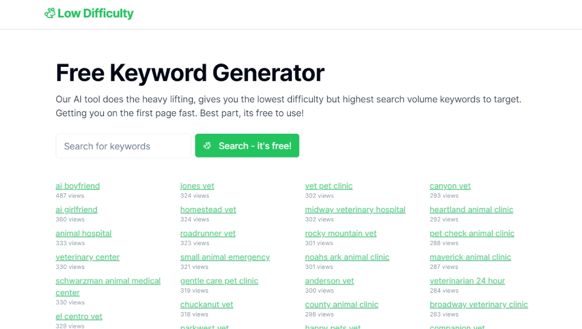 FreeLow Difficulty AI helps identify low-competition keywords for SEO improvement. By focusing on keywords easier to rank for, it boosts website visibility and organic traffic. The tool's "Keyword Difficulty" metric assesses factors like backlinks and on-page optimization of top-ranking pages. It is free to use, catering to individuals, small businesses, and budget-conscious organizations. Users benefit from powerful keyword research without subscription fees or hidden costs.