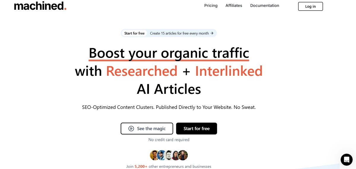 PaidMachined AI is a content creation tool powered by artificial intelligence that streamlines the process of generating SEO-optimized content clusters. It automates the creation of structured, interconnected articles to boost search engine rankings. Ideal for businesses and individuals seeking to efficiently scale their content production and enhance online visibility, Machined eliminates the need for manual keyword research and interlinking. This tool simplifies writing and linking multiple articles on related topics, ensuring relevance and strategic connections. Tailored for businesses, content creators, and SEO professionals, Machined AI conducts keyword research, clustering, and automated linking to facilitate a seamless workflow from beginning to end.