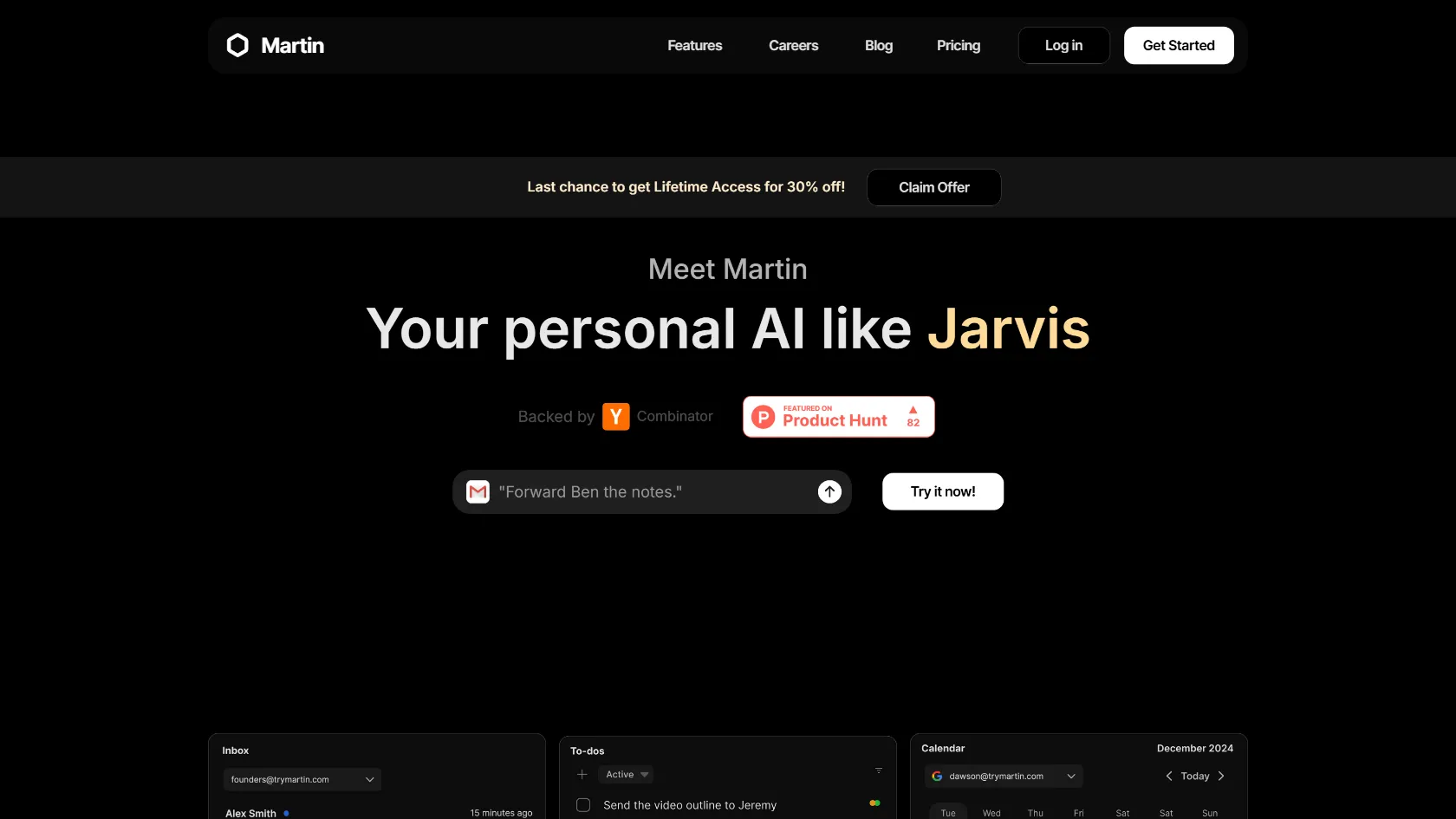Martin is a task management tool that helps you stay organized and efficient. You can schedule meetings, send emails, set reminders, and manage texts through Martin. Just contact Martin via text, call, email, or Slack to make your requests. It seamlessly integrates with your inbox, calendar, and Slack for a smooth experience.