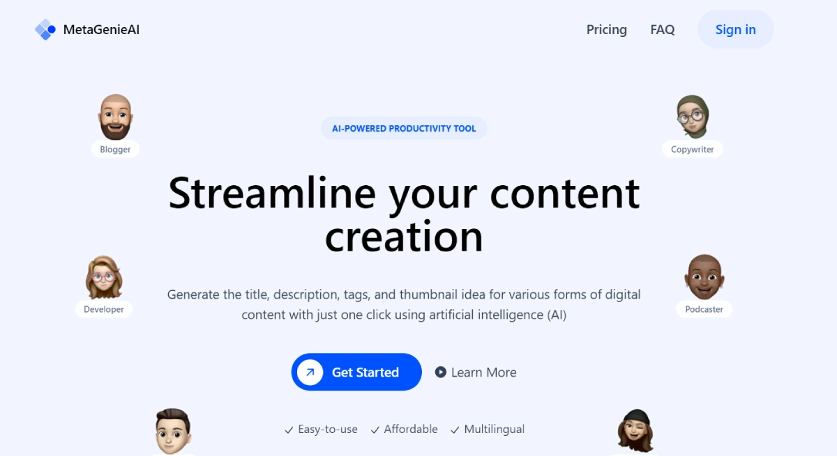 PaidMeta Genie AI helps streamline content creation by automatically generating titles, descriptions, tags, and thumbnail ideas for different digital content types like social media posts, blogs, e-commerce listings, newsletters, videos, and podcasts. This AI-powered productivity tool simplifies the creative process with a single click.