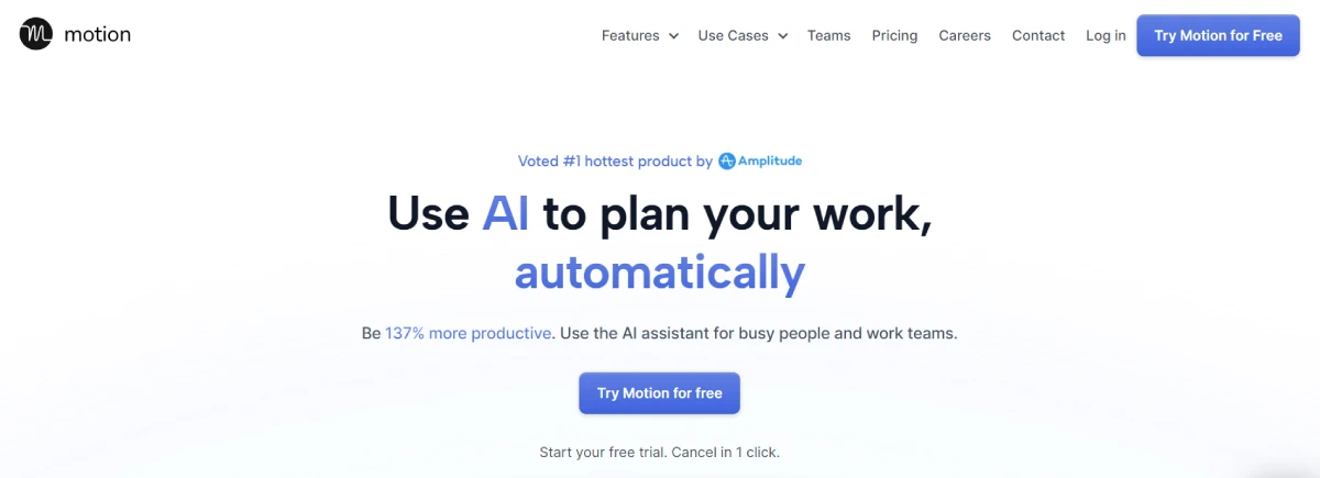 PaidMotion AI is an AI-powered productivity platform designed to streamline task planning, scheduling, and prioritization for both individuals and teams. This tool acts as a virtual assistant, aiding users in managing tasks, projects, and schedules more efficiently. By leveraging its proprietary algorithms, Motion AI automatically generates optimized schedules, organizes tasks based on priority, monitors deadlines, and facilitates team collaboration. With Motion AI, users can enhance productivity and effectiveness in their daily workflows.