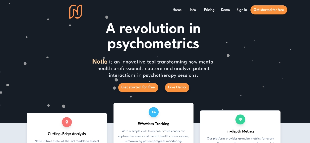 PaidNotle helps mental health professionals capture and evaluate patient interactions more effectively. This innovative psychometric software easily integrates into clinical workflows, simplifying documentation and assessment processes. Developed by a team of engineers, psychologists, and psychiatrists, Notle uses modern AI technology to provide unprecedented analytics capabilities. By analyzing therapy session transcripts, Notle generates psychometric insights that enable providers to optimize treatment with exceptional precision. With a focus on accuracy and adherence to a rigorous manual crafted by psychologists, Notle aims to revolutionize mental healthcare through transformative insights derived from patient interactions.