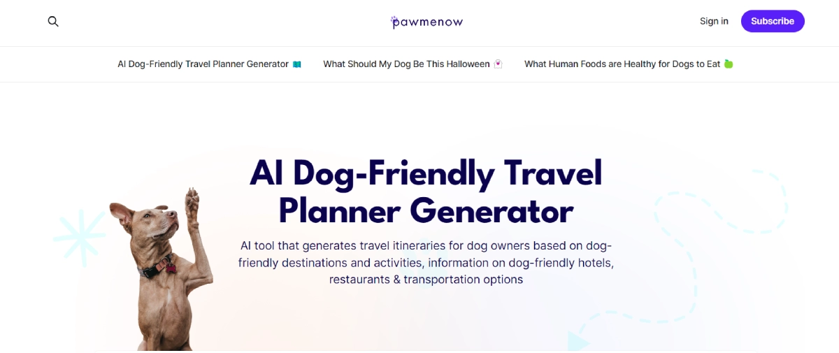 FreePawMeNow is an AI tool that simplifies planning pet-friendly trips. It creates personalized travel itineraries featuring dog-friendly destinations, activities, and practical details like pet-welcoming hotels, restaurants, and transportation options. With PawMeNow, you receive a tailored plan with handpicked spots for you and your furry companion to enjoy together. It suggests accommodations that welcome pets, dining places where both you and your dog can indulge in delicious treats, and transportation services that prioritize pet comfort. This tool takes the hassle out of organizing your next adventure with your four-legged friend by providing all the necessary information in one place.
