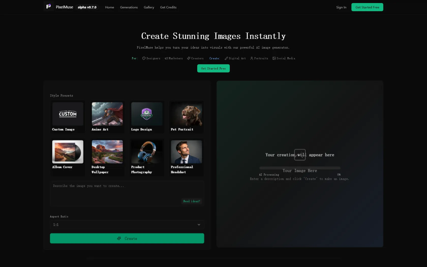 PixelMuse simplifies image creation by enabling users to describe their vision. It caters to individuals without design skills, providing quick generation of digital art, portraits, and social media content through specialized AI models tailored for different purposes.