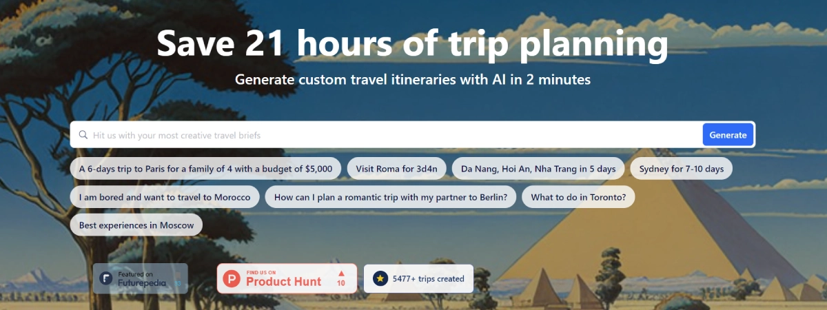 FreePlanTrips is an AI-powered travel planner that saves you 21 hours on trip planning. Generate customized itineraries in just 2 minutes, freeing up more time for exploration. Tailor trips to your preferences, from budget-friendly family vacations to spontaneous getaways. Access over 5,477 community-generated trip ideas for inspiration. Customize itineraries for accessibility needs, like wheelchair-friendly journeys. Discover real-time deals on transportation and accommodations to stay within budget. Benefit from global itineraries and multilingual support for a seamless travel experience. Recognized by Futurepedia and Product Hunt, PlanTrips is a reliable tool for modern explorers.