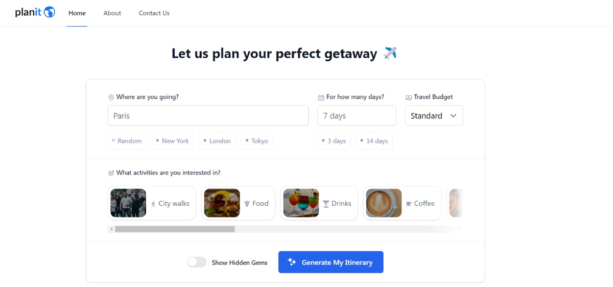 FreePlanit Earth AI is a platform that helps you plan your ideal getaway effortlessly. Simply choose from popular cities like Paris, New York, London, or Tokyo, and customize your trip duration. With just a click on "Generate My Itinerary," Planit Earth creates a personalized travel plan based on your preferences. Whether you want a week in Paris, a weekend escape, or a two-week adventure, this tool tailors the itinerary to suit your timeline. Enjoy the convenience of having your dream trip mapped out for you, taking into account what you love and desire in a vacation.