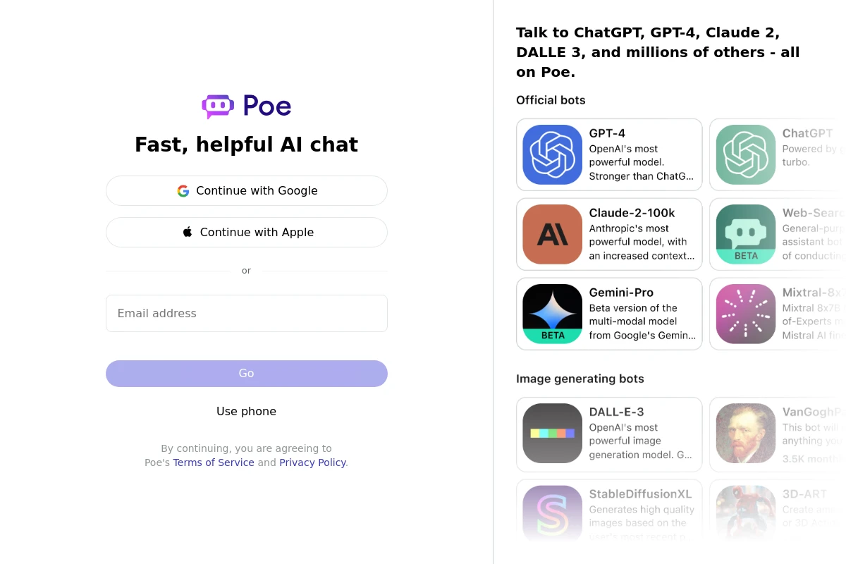 PaidPoe AI helps users access and interact with various AI chatbots through its centralized platform. Created by Quora founder Adam D'Angelo, Poe aims to simplify the experience of engaging with AI bots by serving as an all-in-one browser for them. By offering a desktop app, enterprise features, and regular updates, Poe strives to streamline the process of discovering and communicating with different AI bots without the need to switch between multiple apps. With a vision to connect users easily to a wide range of specialized bots from different companies, Poe eliminates the requirement for separate subscriptions and enhances bot discovery. Recent enhancements such as multi-bot chatting further empower users in an AI-driven future, positioning Poe as a key player in fostering ongoing AI innovation and providing a central access point for interacting with AI technologies.
